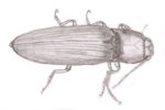 Larvae are up to 20 mm in length and have a shiny pale yellow color. Adults are flattened, elongate, brown or black beetles and 7-8 mm in length.