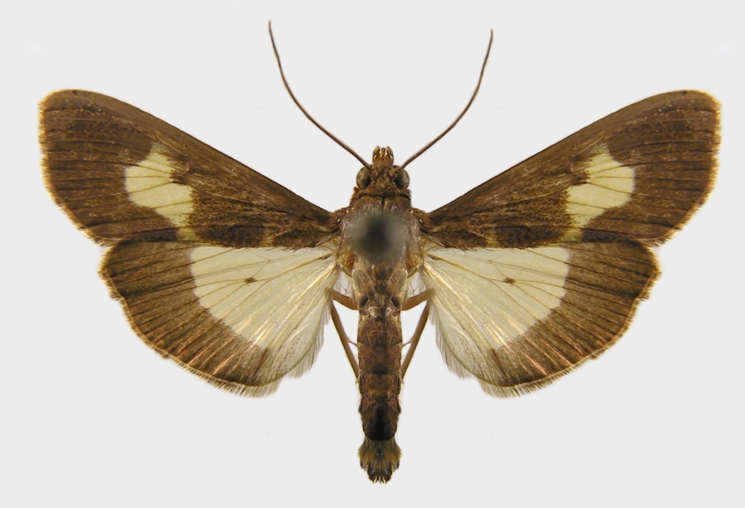 The adult pickleworm moth has a pale yellow spot near the center of each forewing. The ground color is dark brown; the hind wings are pale yellow. On the white-tipped abdomen are dark brush-like hairs present.